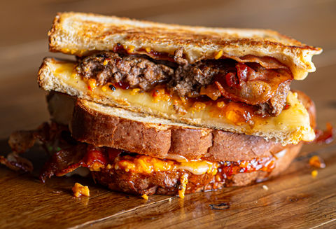 The Georgia Melt: Handcrafted beef patties, topped pimento cheese, mozz, red pepper jelly, applewood smoked bacon, on sourdough